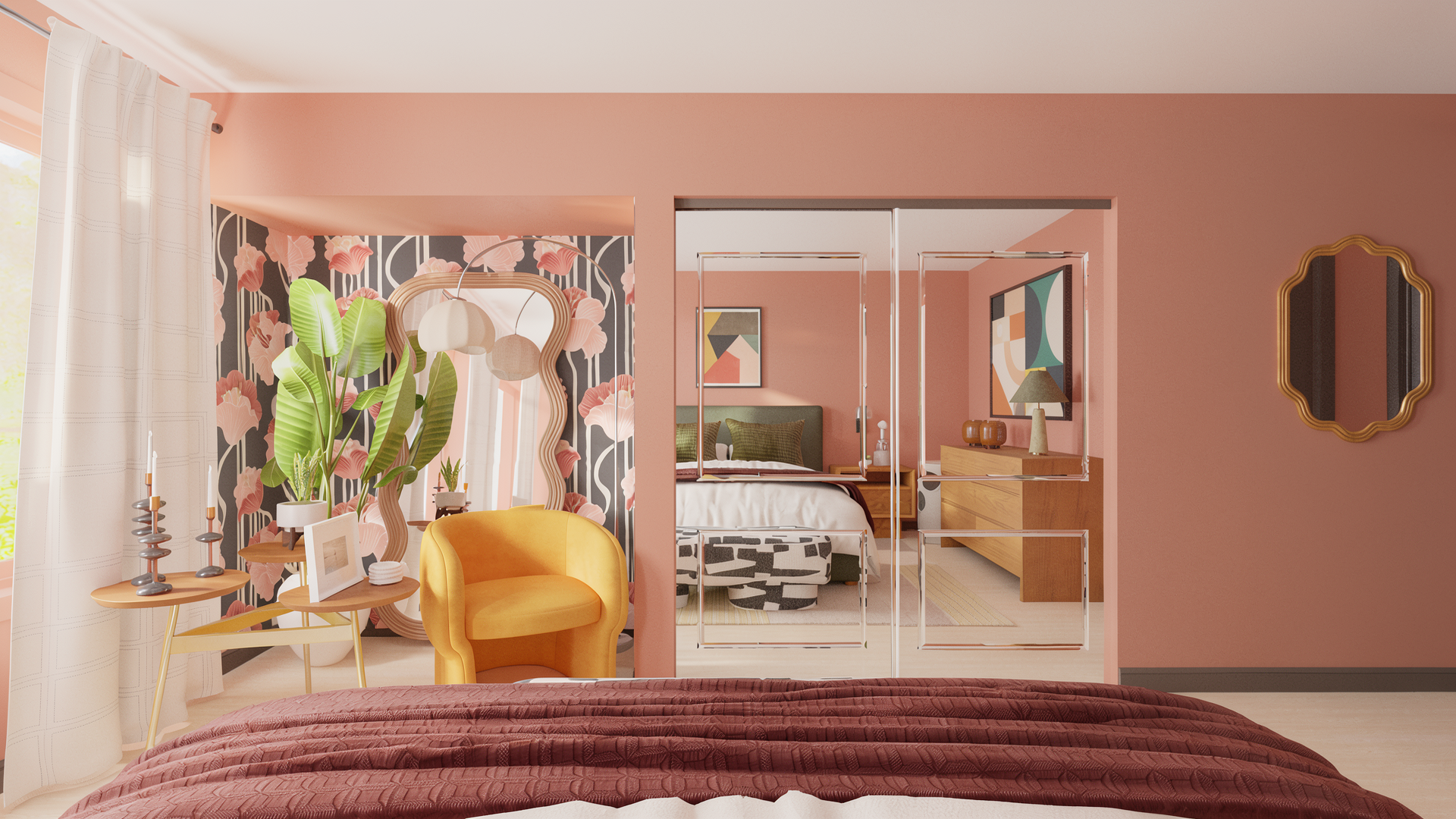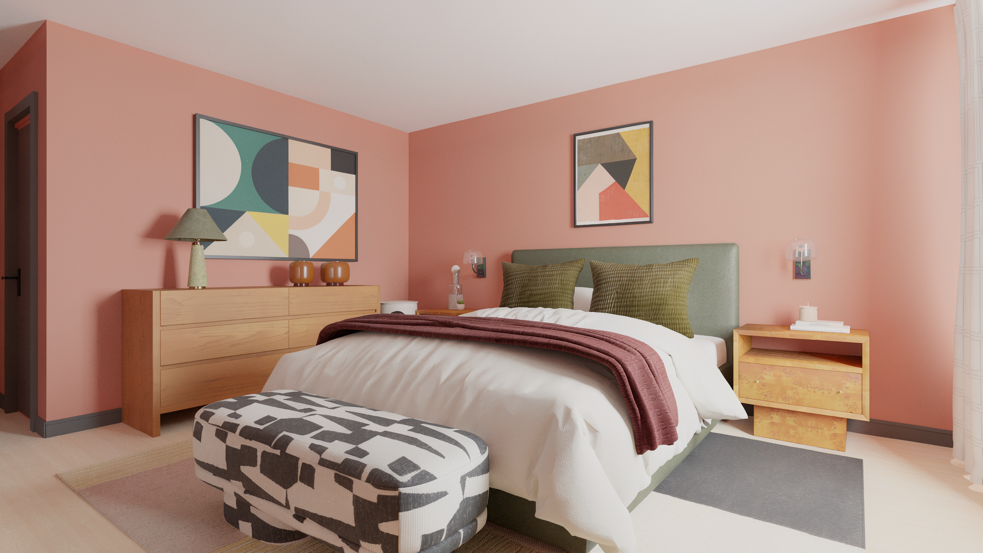 Some people don't want to disappear into their bedroom — they want to wake up in it. Alive was designed for someone who isn't afraid of color, who sees their space as an extension of who they are. Terracotta walls, bold art, and unexpected texture make this room feel like a person, not just a place to sleep.