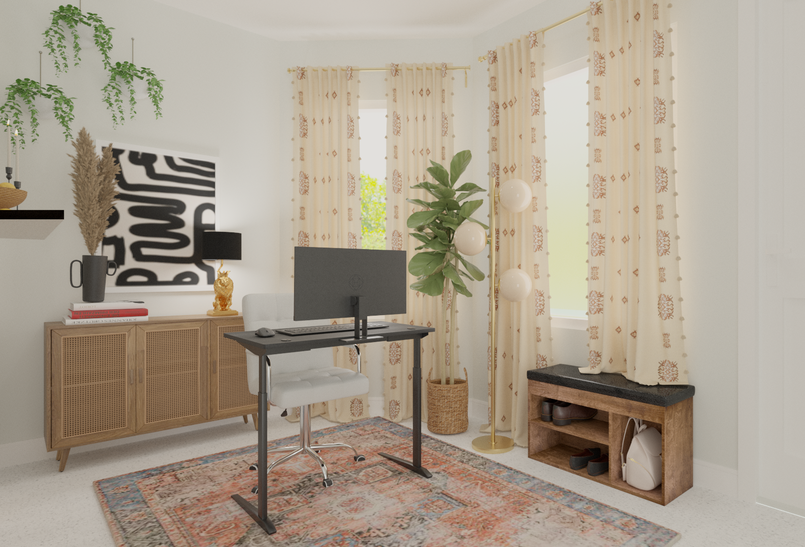 A workspace shouldn't feel like a punishment. Flow was designed for someone who creates for a living — or lives to create — and needed a room that could hold both focus and imagination. Plants, pattern, and warm light make this office feel less like a place you have to be and more like a place you want to return to.