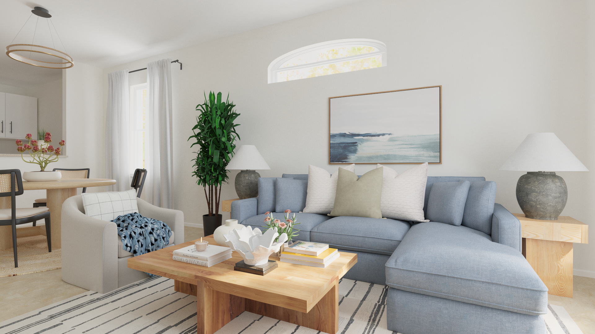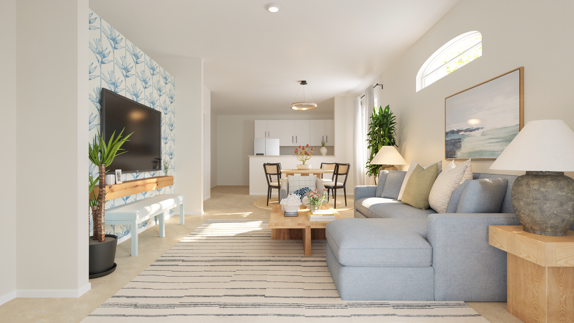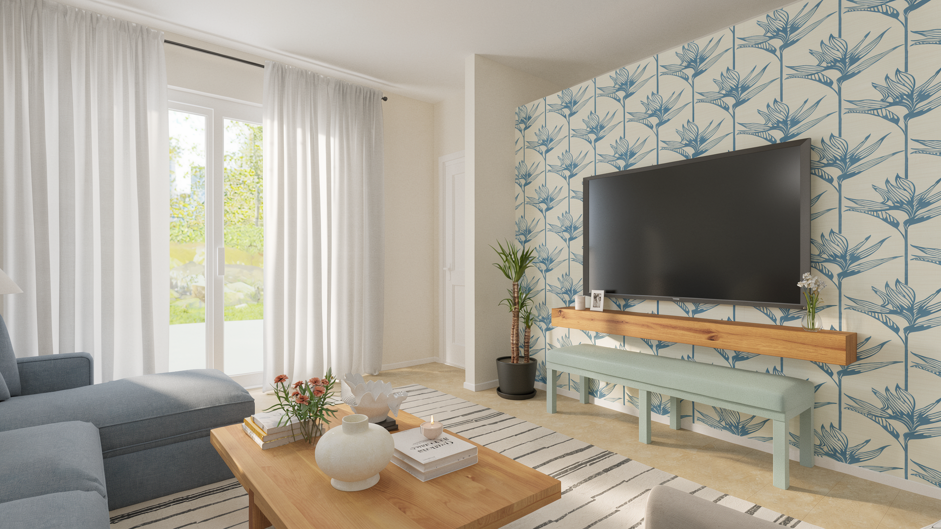 This space was designed around one feeling: quiet. Not empty — quiet. The soft blue sectional, the floral wallpaper feature wall, and the flood of natural light were all chosen to create a room that slows you down the moment you walk in. Still is for the person who comes home and needs the noise to stop.