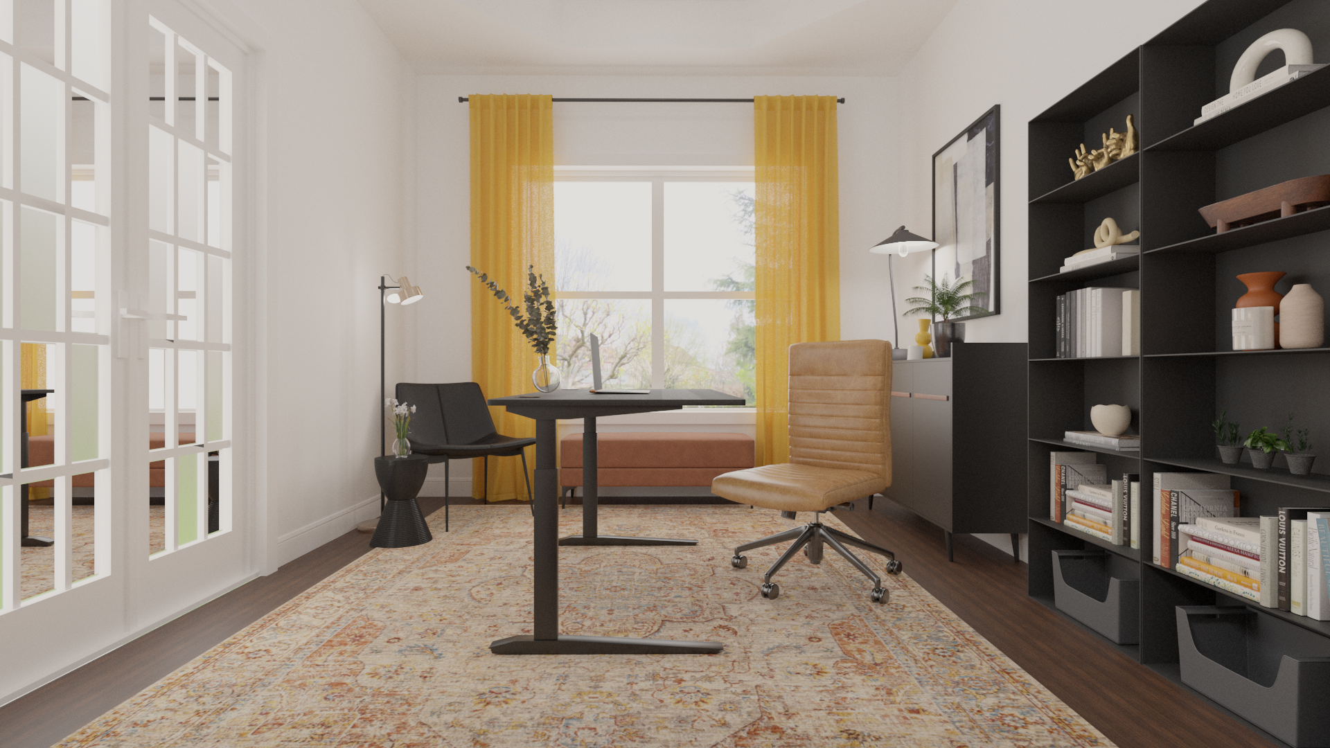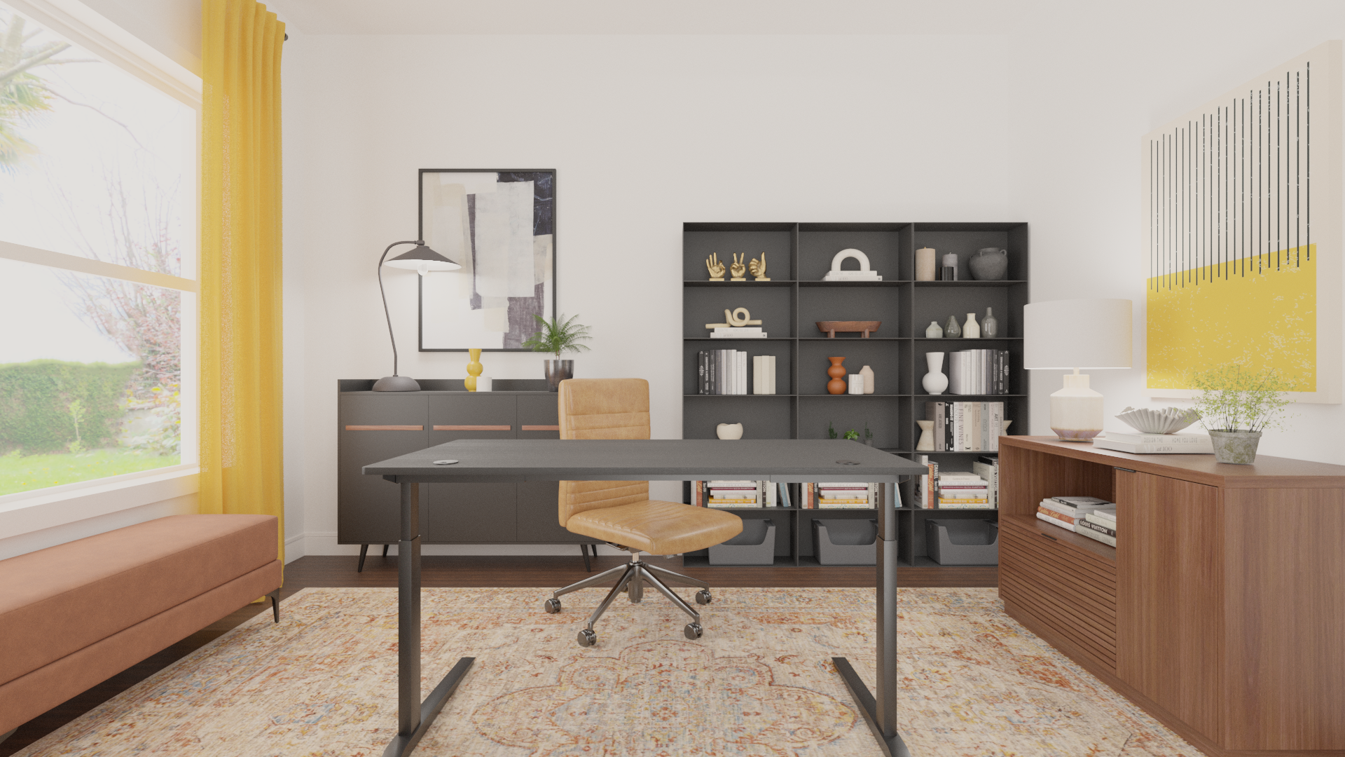 Dark, deliberate, and completely unapologetic. Focused was designed for someone who does their best work when the room means business. Deep tones, clean lines, and a flash of golden yellow keep it from feeling heavy — this is a space that takes you seriously because you take your work seriously.